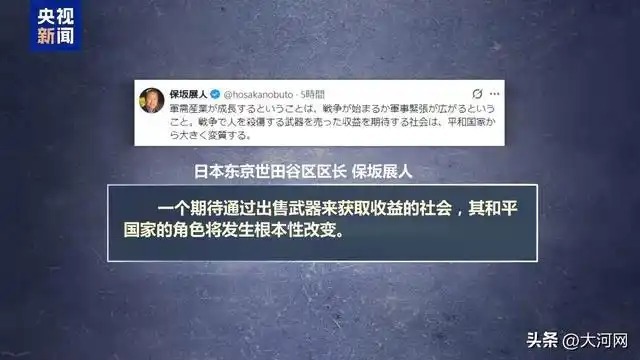 日本东京世田谷区区长保坂展人在社交媒体上表示,一个期待通过出售武器来获取收益的社会,其和平国家的角色将发生根本性改变。