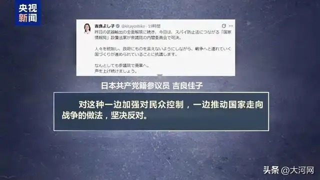 日本共产党籍参议员吉良佳子说,日本政府一面解禁杀伤性武器出口,一面推动设立“国家情报局”。对这种一边加强对民众控制,一边推动国家走向战争的做法,她表示坚决反对。(来源:央视新闻客户端 版权归属原作者,如有侵权请联系删除㉒)举报/反馈