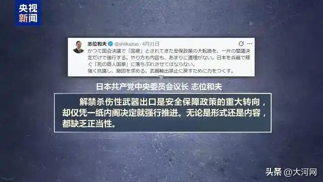 日本共产党中央委员会议长志位和夫表示,解禁杀伤性武器出口是安全保障政策的重大转向,却仅凭一纸内阁决定就强行推进。无论是形式还是内容,都缺乏正当性。不能让日本沦为靠武器牟利的“死亡商人”,将尽全力恢复武器出口禁令。